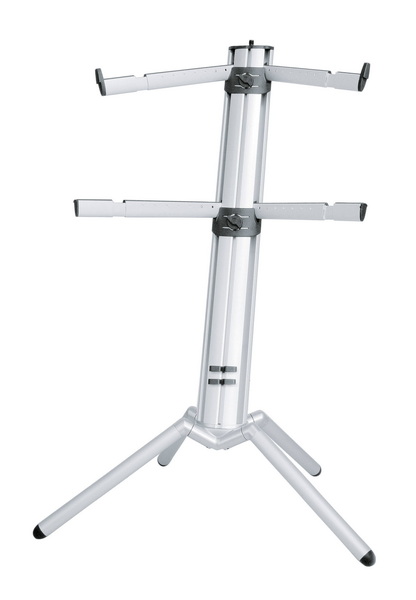 K&M 18860-000-30 — стойка для клавишных инструментов. Стойка снабжена двумя парами раздвижных «рук», одна из которых расположена под углом 15 градусов. Не может не порадовать функция, которая позволяет теперь добавить еще один уровень для третьих клавишных. У 18860-000-30 есть 3/8″» или 5/8″» коннектор для присоединения микрофонной стойки. Угол наклона самой стойки стал намного удобнее, чем был раньше — теперь вам будет удобнее использовать две клавиатуры сразу. Корректировка высоты осуществляется за счет удобных зажимных механизмов – подняв полку на нужную высоту надо просто повернуть рычажок. Кроме того стойку удобно хранить и транспортировать – она максимально складывается за счет задвигаемых ножек и полок, после чего ее можно убрать в узкий чехол, который продается отдельно.